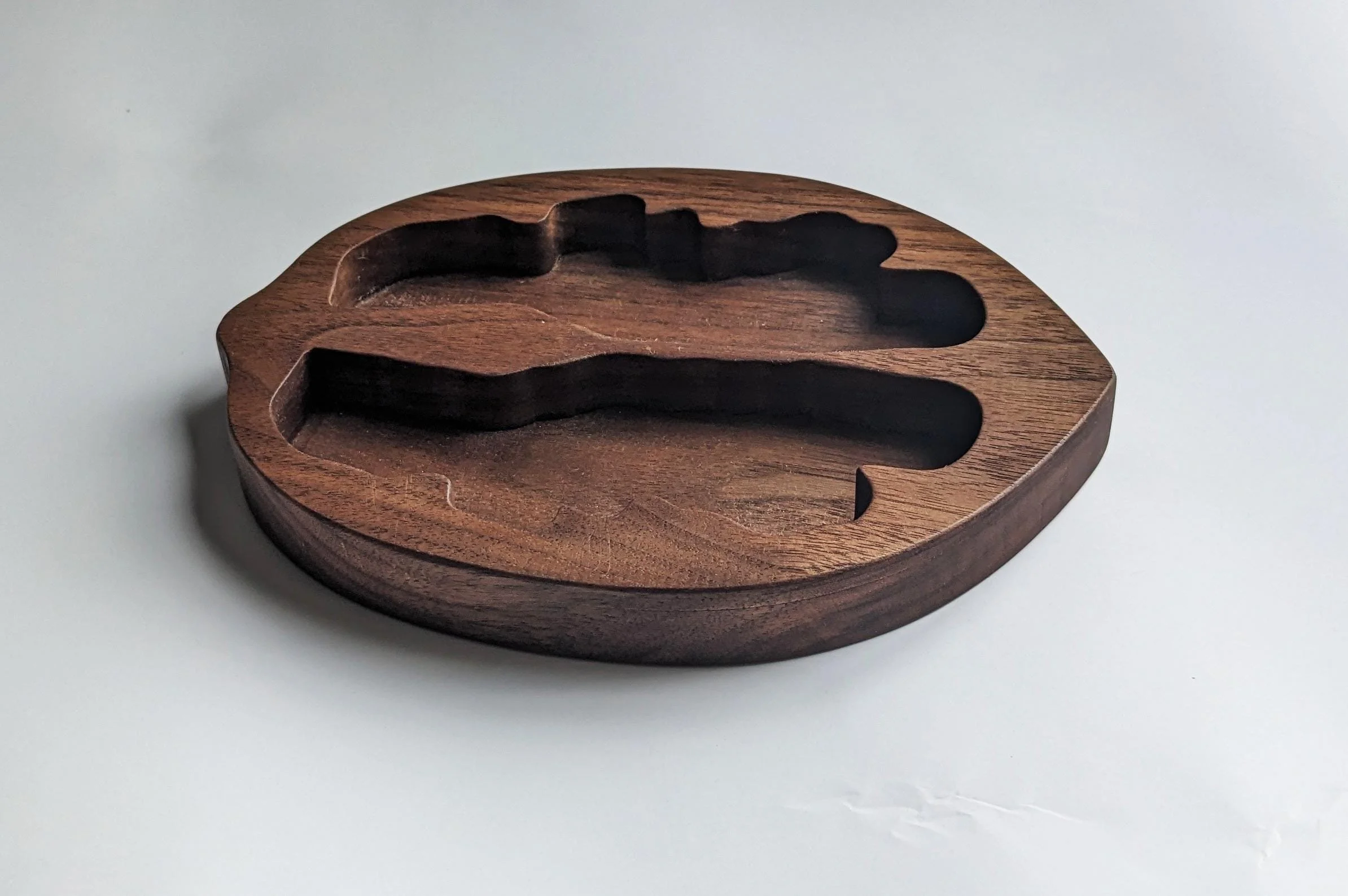 - The walnut tray was meticulously handcrafted in my shed, reflecting my passion for woodworking and attention to detail and practical elegance.