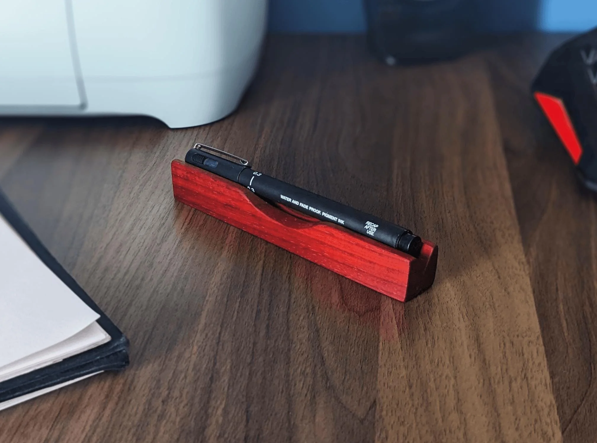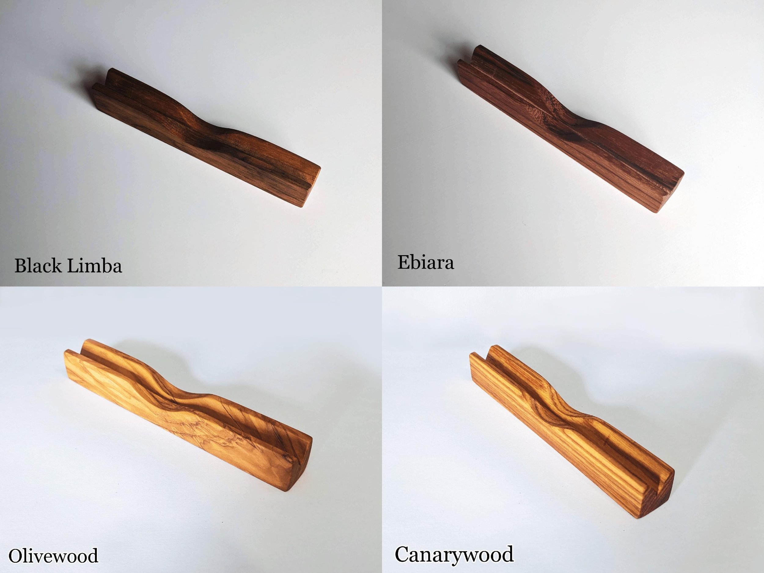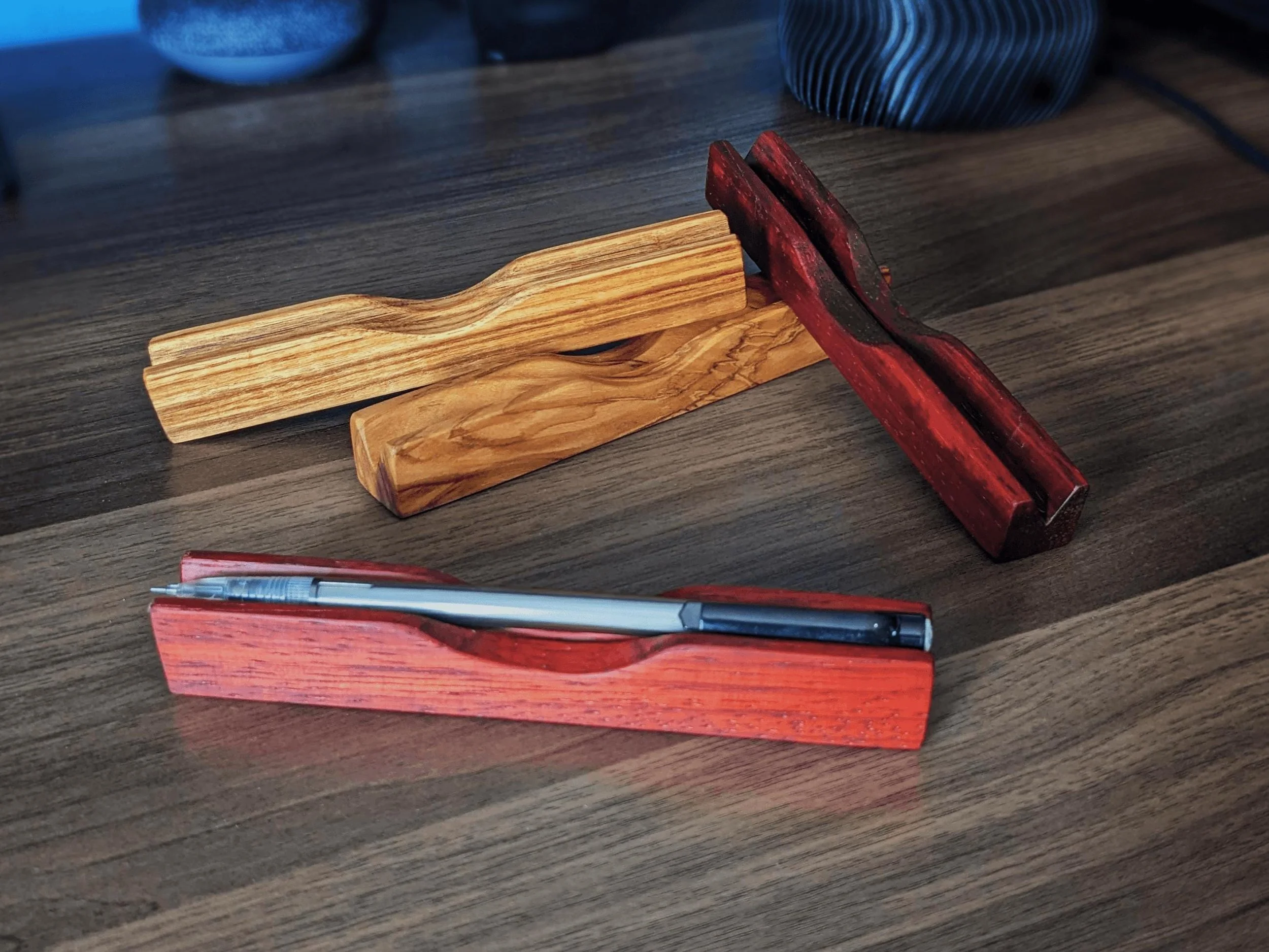 Discover our solution to desk organization with our Elegant Modern Exotic Hardwood Pencil Holder desk organiser and pen rest. Handcrafted for you, these pencil holders are designed to complement any workspace with their natural beauty and minimalistic design to bring workspace elegance through modern organisation. Crafted from dense exotic hardwood, they hold a luxurious weight that keeps them steadfast on your desk, while the thoughtful finger groove allows for easy retrieval of your writing tools from the wooden pencil rest without needing to fumble around.